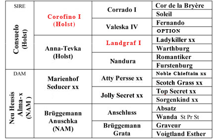 Landgraf I was the first Warmblood sire whose progeny turned him into a 6,5 Million DM millionaire, making him one of the most successful sires in the world. Romantiker is the grandson of Ramzes, the outstanding sire that produced sport horses in all the Warmblood Studbooks. Alma-x is a daughter of Seducer xx, a thoroughbred stallion who won the triple crown, i.e. Namibian Showjumping Championship, Namibian Dressage Championship and the Namibian Eventing Championship in the same year.