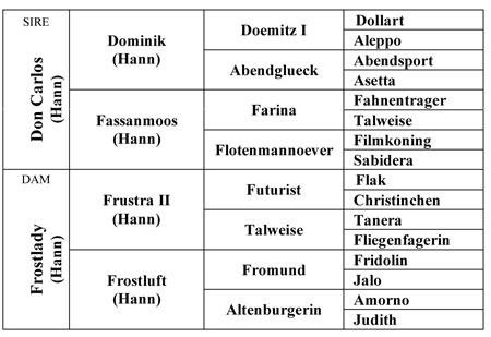 Don Carlos sired numerous approved sons such as Dakar, Don Juan, Don Pedro, Dynamo and Domino, including the very successful Dolorit, who sired jumpers like Billy Onduno (winner of SA Derby with Wayne Dale), Davetsaub Lombard (competed at World Equestrian Games with Jonathan Clarke) and the A Grade horses, Lord Davetsaub (Rogan Asken), Lorbas (Anne-Marie Esslinger) and Globus ridden by Roger Hessen. Frustra II, was also a very successful sire and sire of dams, producing quite a number of very useful horses.