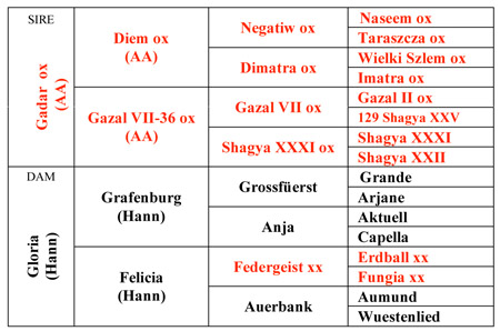 Anja produced besides, Grafenburg, the approved Hanoverian stallion, Guarantar (by Grossfurst) and the Bayern stallion, Peppino (by Paquirri). Federgeist xx is the sire of the sport horses, Fantastic 5, Finett and Flagrant.